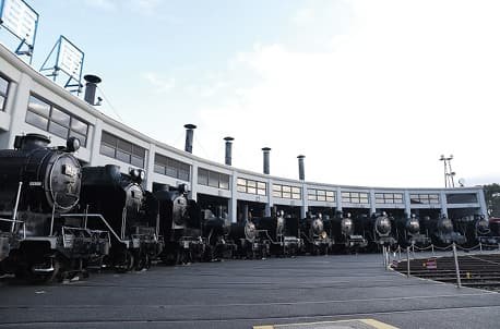 懐かしの蒸気機関車や電気機関車、新幹線が勢ぞろいしている